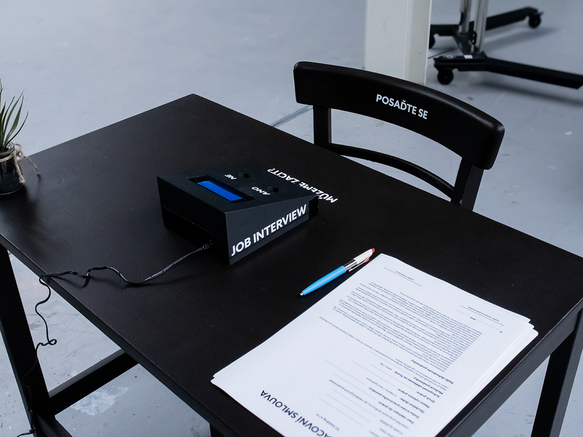 This is a game installation which is trying to get the subject that is doing the interview to be stressed out.